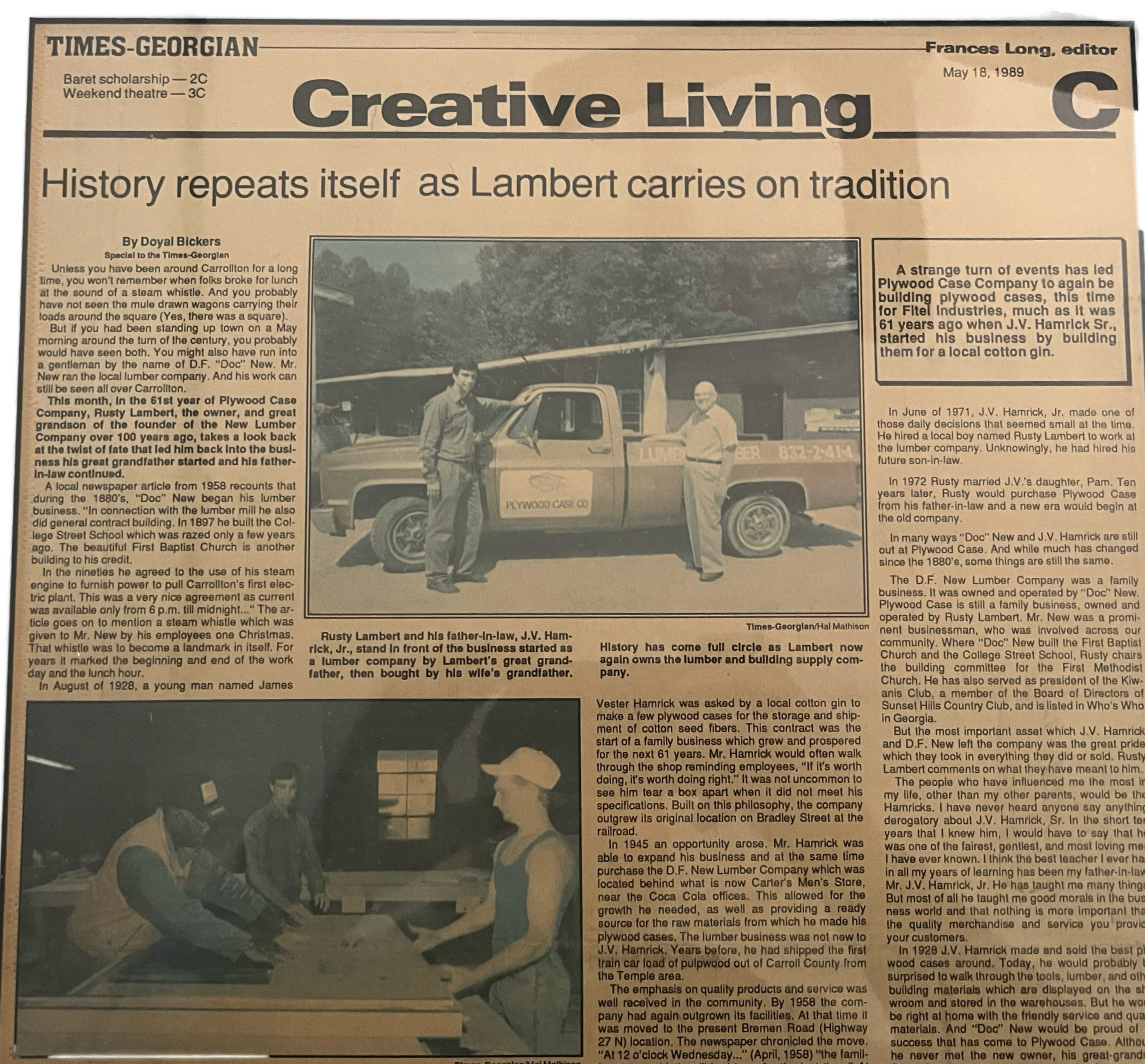 Established in 1928 by no-nonsense businessman James Vester Hamrick Sr. (J.V.), Plywood Case Company earned its name from Hamrick’s original product: plywood cases used to ship cottonseed by rail. In 1949, Hamrick purchased a local lumber mill, D.F. New Lumber Company, and incorporated it into the existing business. In 1958, he turned the company over to his son, James Vester Hamrick Jr. (“Big Daddy”), and relocated the business from downtown Carrollton to its current location on Highway 27. At that time, Plywood Case evolved into a full-line building supply company serving the West Georgia area.